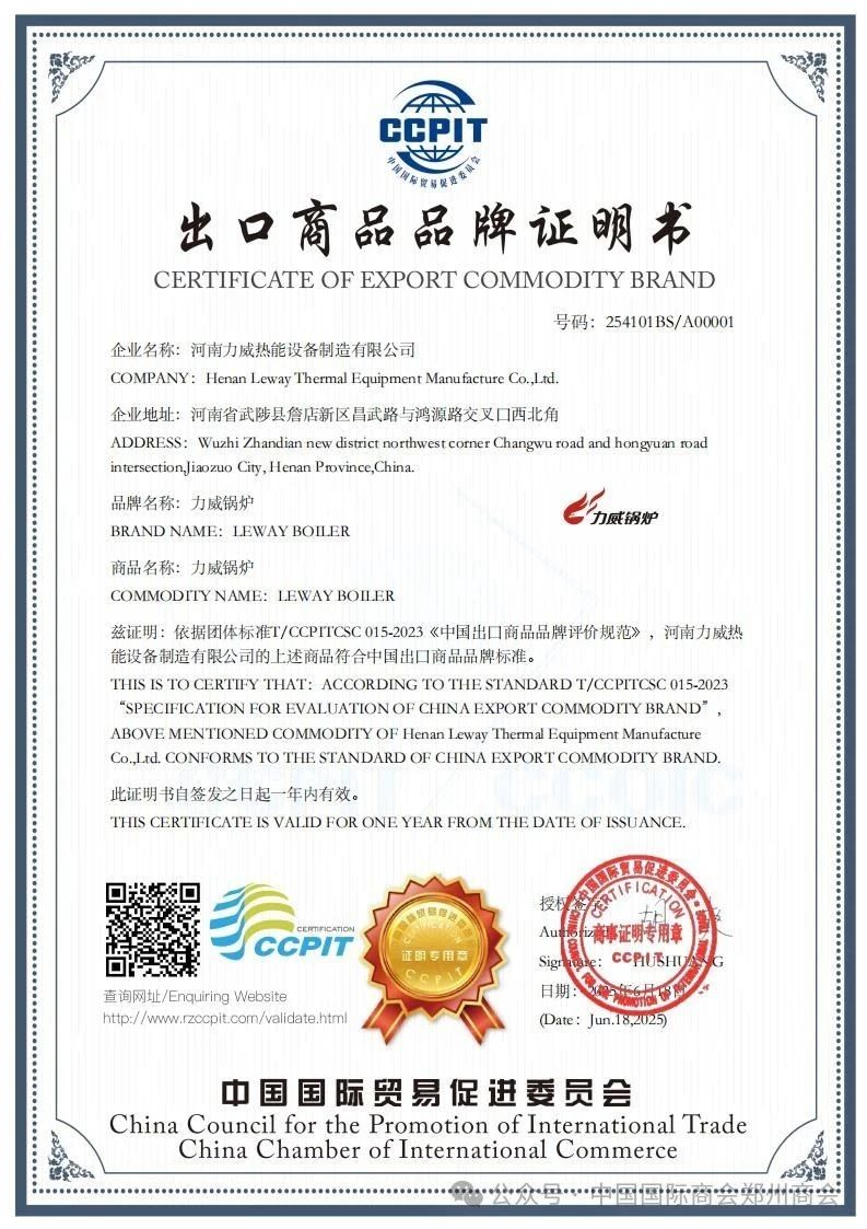 近日,河南力威熱能設備制造有限公司榮獲中國國際商會鄭州商會簽發的首份出口商品品牌證明書。在全球化經濟背景下,商品品牌已成為企業核心競爭力的關鍵要素。品牌不僅代表...